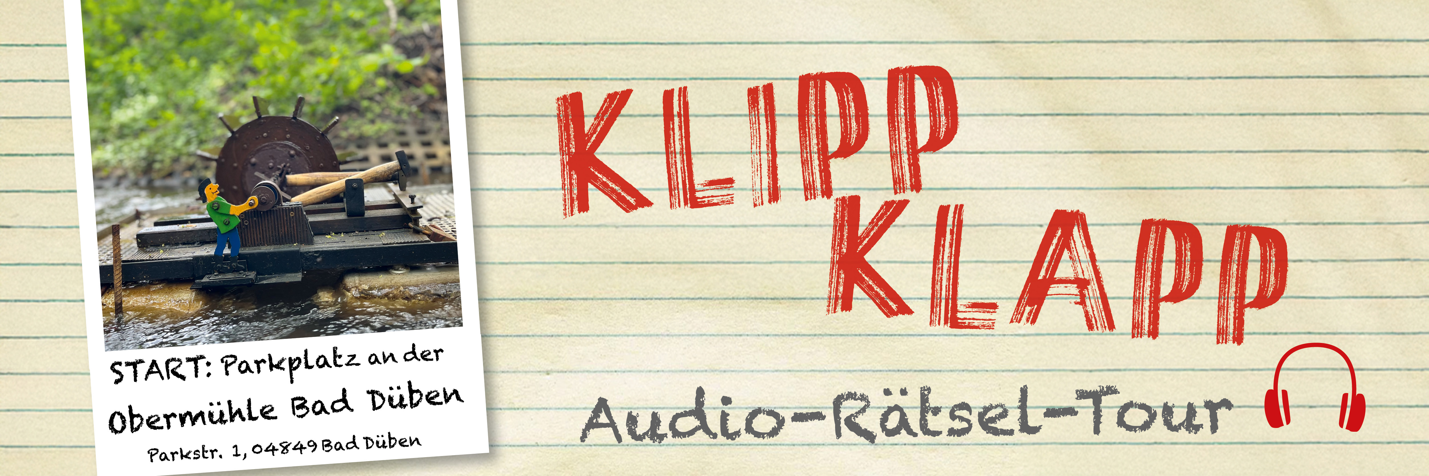 Die "Klipp Klapp" Audio-Rätsel-Tour bietet einen ca. 2-stündigen Spaziergang entlang der Mühlen von Bad Düben für ein bis fünf Mühlenfans ab 12 Jahren. Dabei erkunden Sie die Geheimnisse der Mühlen, hören interessante Anekdoten von Menschen aus Bad Düben und können die Schönheit dieser idyllischen Stadt genießen. Lassen Sie sich dabei einfach von Ihrem Smartphone navigieren! Start ist der Parkplatz an der Obermühle Bad Düben, Parkstr. 1.