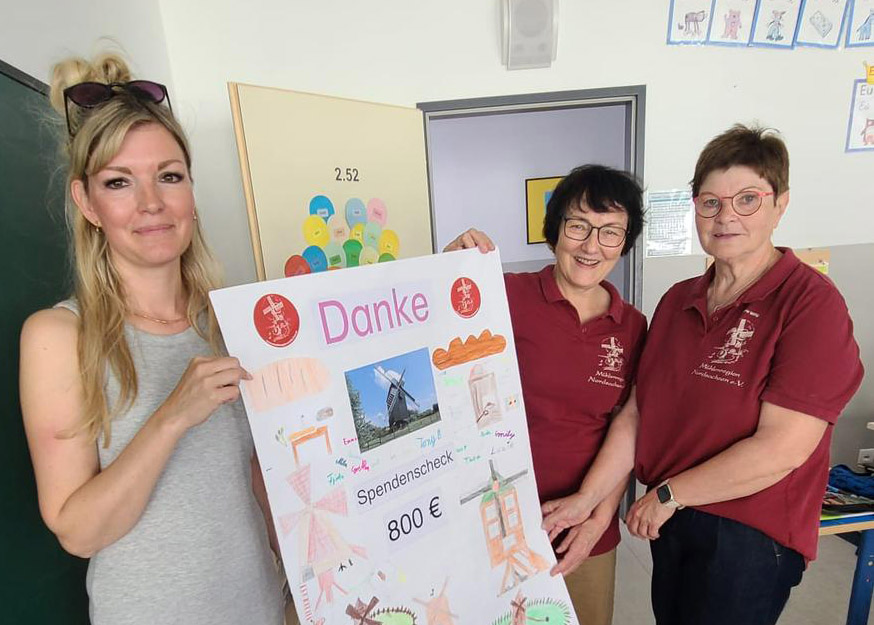 Die offizielle Übergabe der Spende in Höhe von nunmehr 800 Euro fand am 3. Juni 2025 in der Regenbogen-Grundschule Taucha statt. Die Kinder hatten unter Anleitung ihrer Lehrerin Katja Lindner eigens dafür zwei große Plakate mit Mühlen gezeichnet. Die beiden ehrenamtlichen Projektmitarbeiterinnen Liane Willig und Heike Liesaus sowie die Geschäftsführerin Andrea Heyn bedankten sich herzlich bei den Kindern und verrieten auch, wofür die Spende verwendet werden soll: Der große Holzbackofen an der Bockwindmühle Hohenroda, in dem die Brötchen für den Projekttag gebacken werden, muss in den Sommerferien dringend repariert werden. Und das ist nur mit Hilfe von Fördermitteln und Spenden möglich. Herzlichen Dank.
